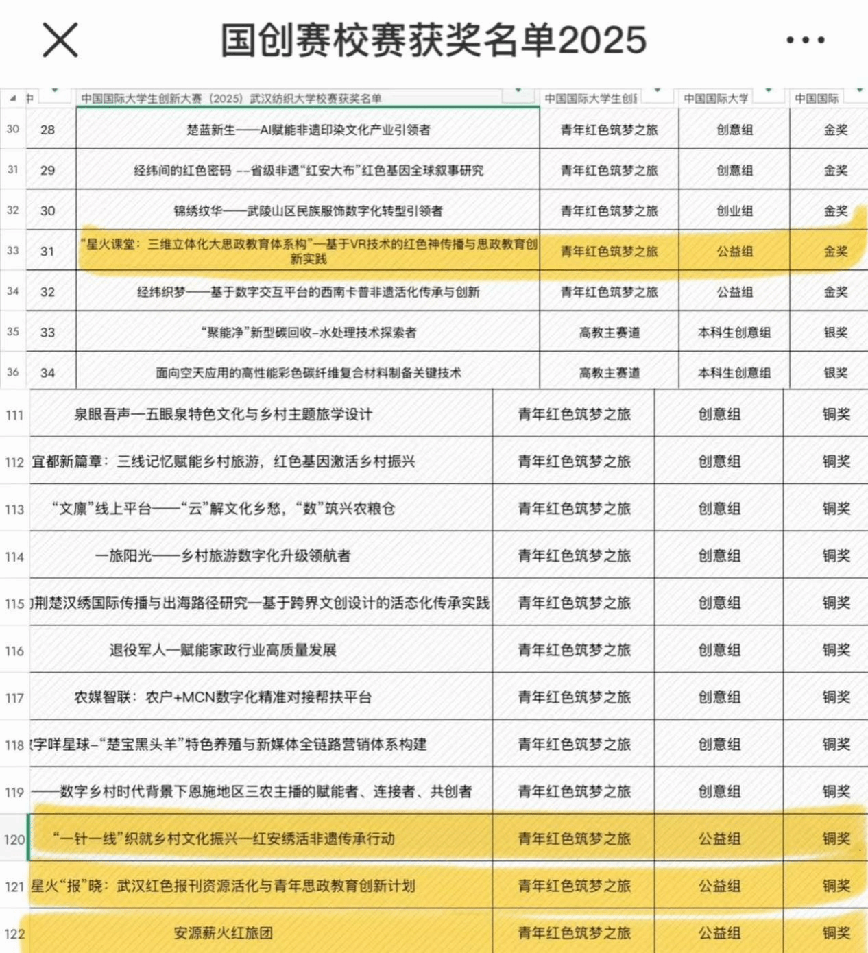 这些获奖项目精准聚焦VR思政、非遗传承、红色资源活化和文旅融合四大领域。金奖项目“星火课堂”直面传统思政教育形式单一的痛点,通过社会实践调研,创新性地运用VR技术,融入珍贵访谈史料及视频资源,构建了三维立体化思政教育平台,有效推动红色文化的传播与弘扬。"一针一线"项目聚焦国家级非物质文化遗产“红安绣活”,团队深入乡村,以“非遗研学、创意设计、品牌赋能”的模式,探索出一条以非遗技艺传承带动乡村女性就业、促进乡村文化振兴的创新路径。星火"报"晓项目深入挖掘武汉红色报刊资源,致力于将其转化为青年喜闻乐见的思政教育产品,探索“红色资源活化”与“思政教育创新”融合的新路径。安源薪火红旅团立足乡村教育资源匮乏、研学模式不成熟等问题,提出了“双向研学”的文旅模式,整合红色文化和科学技术等资源,开展以“红+蓝+橙”为主要形式的城市研学、“红+绿+古”为主要形式的乡村研学。