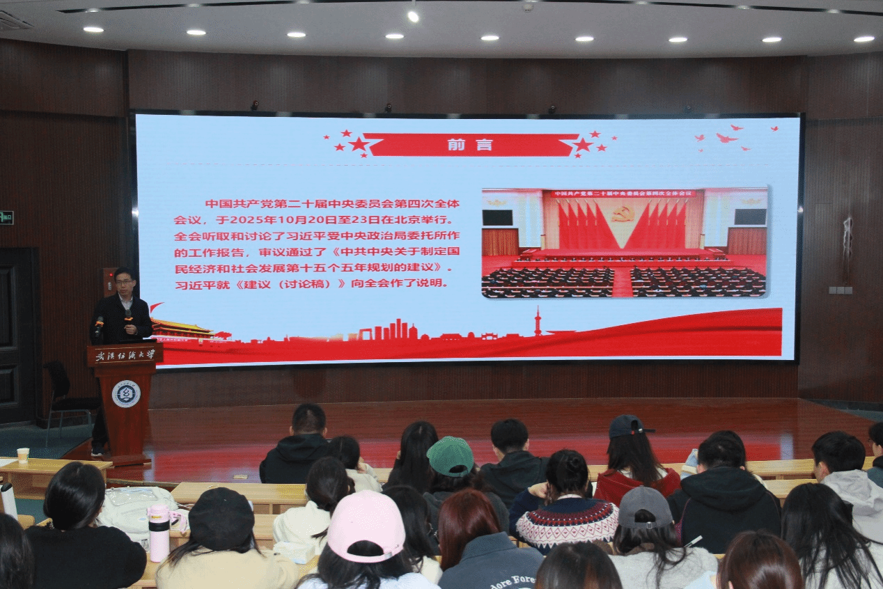 王海燕系统阐述了党的二十届四中全会的意义与成果,指出全会最重要的成果是审议通过了《中共中央关于制定国民经济和社会发展第十五个五年规划的建议》。随后,他深入解读了“十五五”规划建议,并指出“十五五”时期是基本实现社会主义现代化的关键五年,具有承前启后的重要意义,并具体阐释了这一时期的指导思想,以及坚持党的全面领导、人民至上、高质量发展等六大重要原则。王海燕倡导员工要认真研读、准确把握党的二十届四中全会精神的核心要义和新表述,同时鼓励同学们积极参与学院组织的学术活动,尤其是关于党的最新理论的学习讲座。